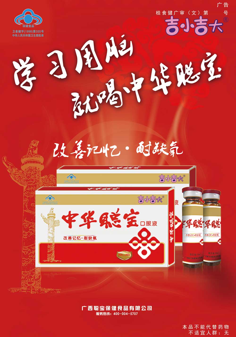 中華聰寶口服液是以黃芪、茯苓、山蓮藕等天然植物為主要原料,經(jīng)先進(jìn)生產(chǎn)工藝精制而成的保健食品。本品功能實(shí)驗(yàn)證實(shí)可提高記憶商數(shù),具有改善記憶的保健作用,本品還可提高機(jī)體對(duì)缺氧環(huán)境的耐受能力,具有耐缺氧的保護(hù)作用。